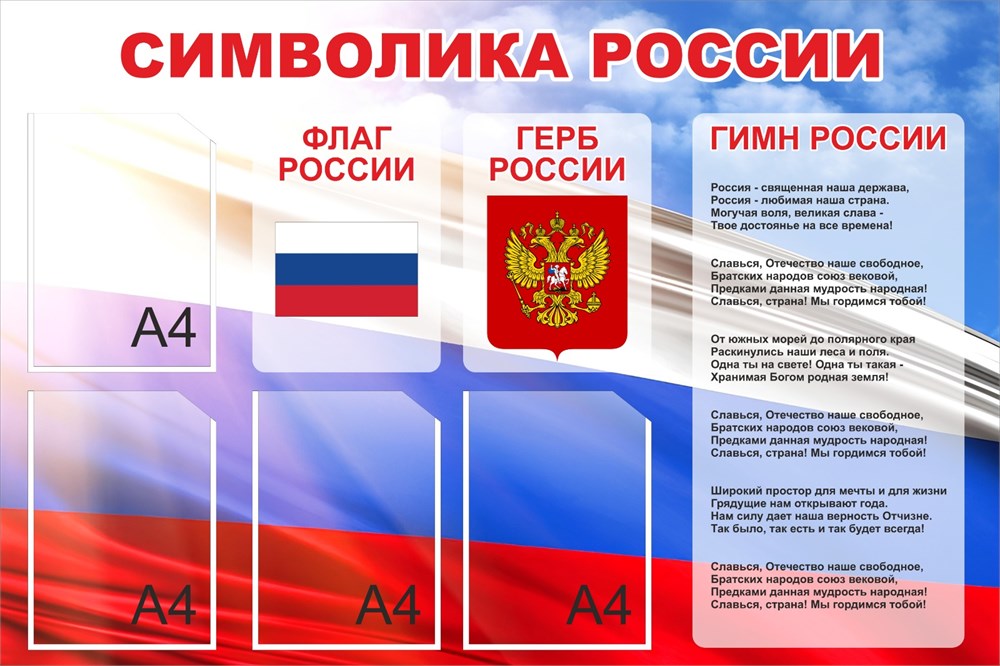 Стенд Символика России 1200 х 800. ПВХ-3мм. карман А4-4шт. (фон триколор)