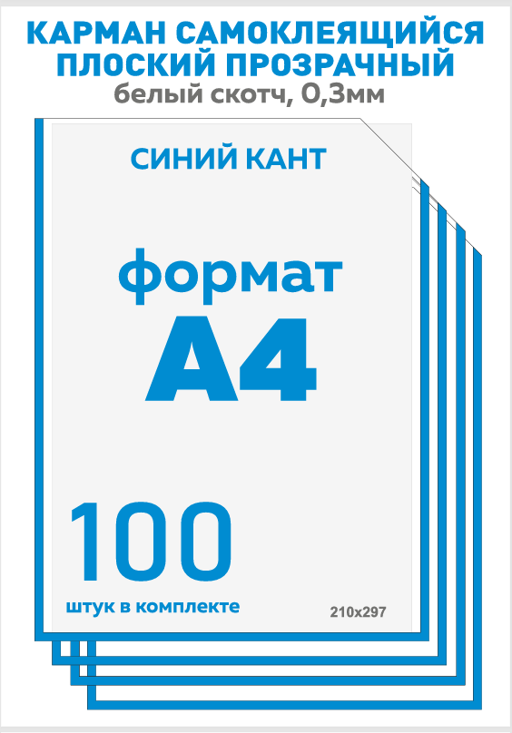Карман для стенда А4 вертикальный 100 шт. со скотчем, синий кант, ПЭТ-0,3мм